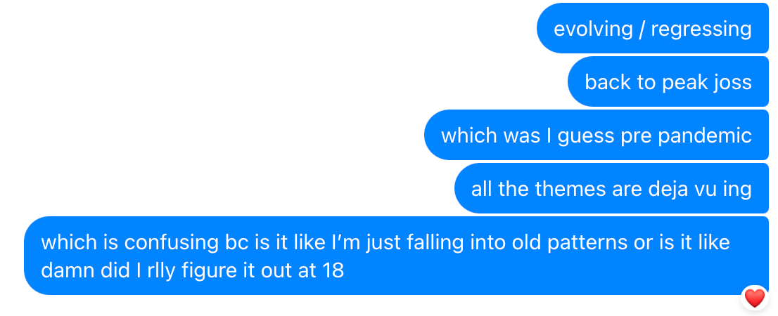 In other news, this week I was dealing with some feelings and frustrations and sat down and wrote them all out. This has been my long-term coping mechanism for working through things, a form of self-therapizing. A framework my mom learned and passed down is “okay” (acknowledge all the details about your current situation), “but what do I want” (be explicit about where you’d like to be) and then “and how am I going to get there” (self-explanatory, connect the dots). Even a loosely structured feelings dump has a way of making my feelings a lot more manageable — the one I wrote the other day ended with this: